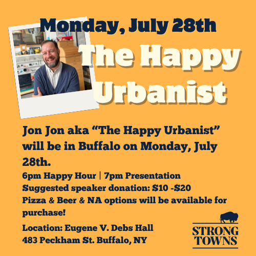 Jon Jon aka “The Happy Urbanist” will be in Buffalo on Monday, July 28th to discuss the case for low-traffic neighborhoods and how to win people over! Join us for “Everyone Hates Traffic” at Eugene V. Debs Hall (483 Peckham Street) to hear from Jon Jon and connect with other strongtowns members! Doors open at 6pm with the presentation starting at 7pm. Pizza & Beer (including NA options) will be available for purchase.